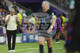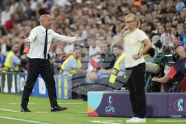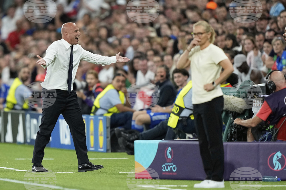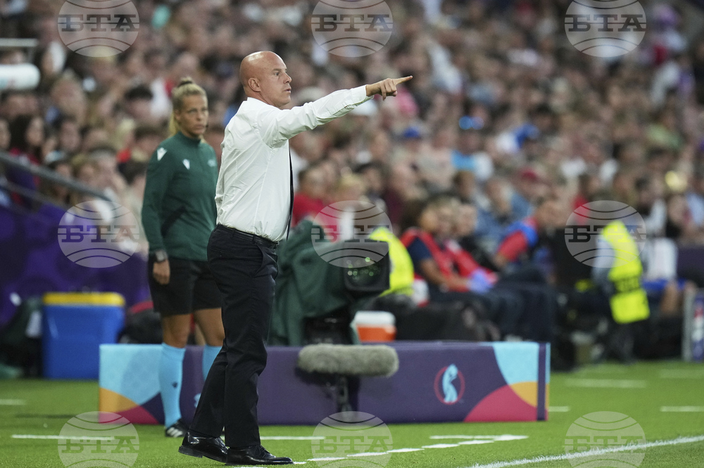 England head coach Sarina Wiegman gestures during the Women's Euro 2025 semifinals soccer match between England and Italy at Stade de Geneve in Geneva, Switzerland, Tuesday, July 22, 2025. (AP Photo/Alessandra Tarantino)
