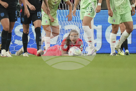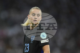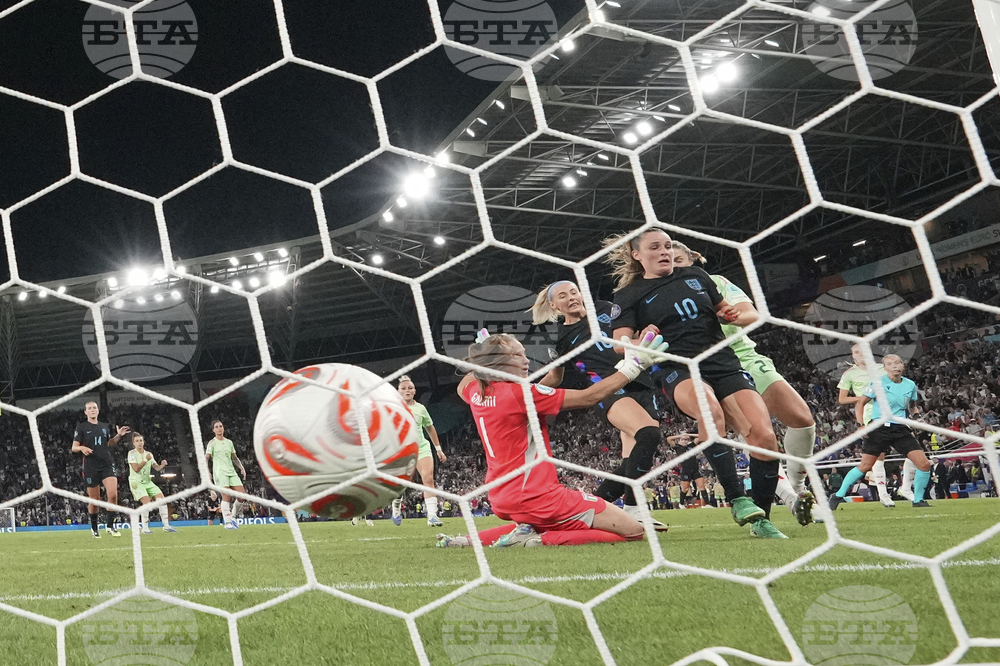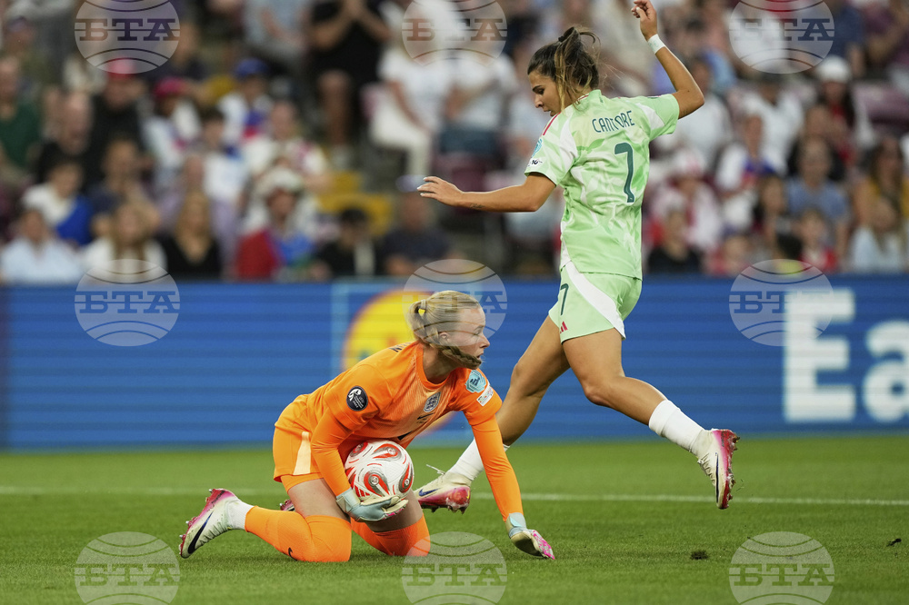 England's Aggie Beever-Jones picks up the ball after a goal by England's Michelle Agyemang during the Women's Euro 2025 semifinals soccer match between England and Italy at Stade de Geneve in Geneva, Switzerland, Tuesday, July 22, 2025. (AP Photo/Martin Meissner)