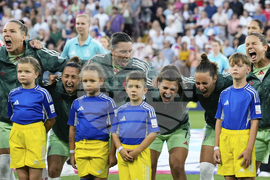 England players stand during the national anthem before the Women's Euro 2025 semifinals soccer match between England and Italy at Stade de Geneve in Geneva, Switzerland, Tuesday, July 22, 2025. (AP Photo/Martin Meissner)