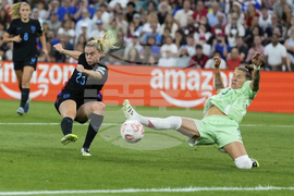 England's Chloe Kelly (18) scores past Italy's goalkeeper Laura Giuliani, right, during the Women's Euro 2025 semifinals soccer match between England and Italy at Stade de Geneve in Geneva, Switzerland, Tuesday, July 22, 2025. (Jean-Christophe Bott/Keystone via AP)