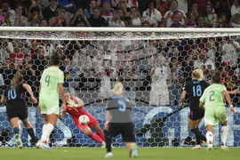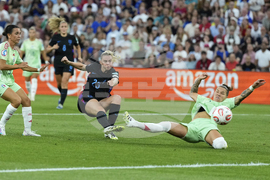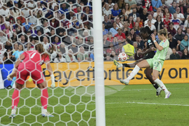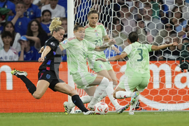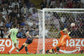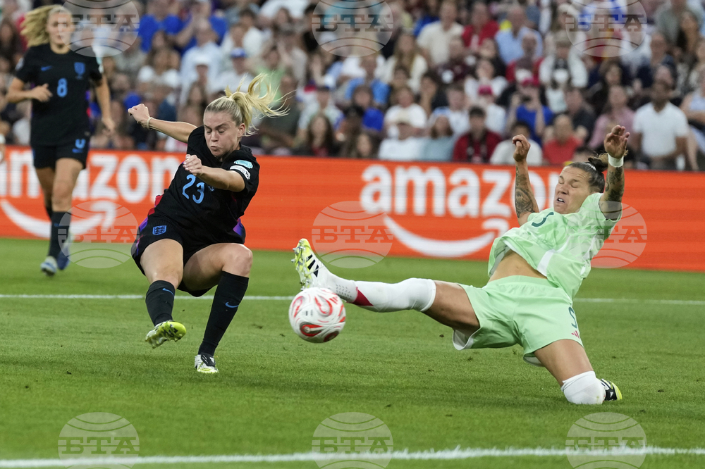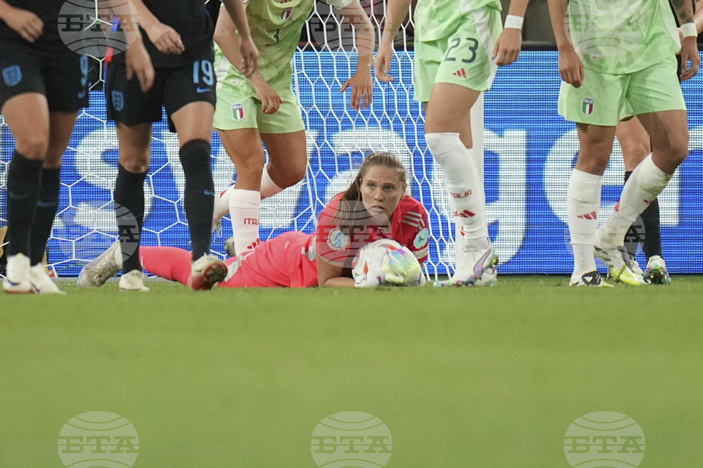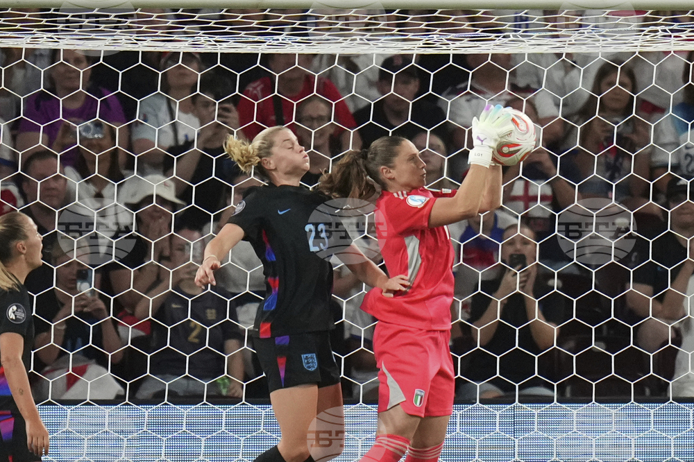 Italy goalkeeper Laura Giuliani dives but fails to save the goal from England's Michelle Agyemang during the Women's Euro 2025 semifinals soccer match between England and Italy at Stade de Geneve in Geneva, Switzerland, Tuesday, July 22, 2025. (AP Photo/Martin Meissner)