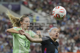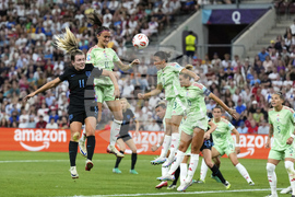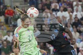 Italy's Elena Linari jumps for the ball with England's Michelle Agyemang, background, during the Women's Euro 2025 semifinals soccer match between England and Italy at Stade de Geneve in Geneva, Switzerland, Tuesday, July 22, 2025. (AP Photo/Alessandra Tarantino)
