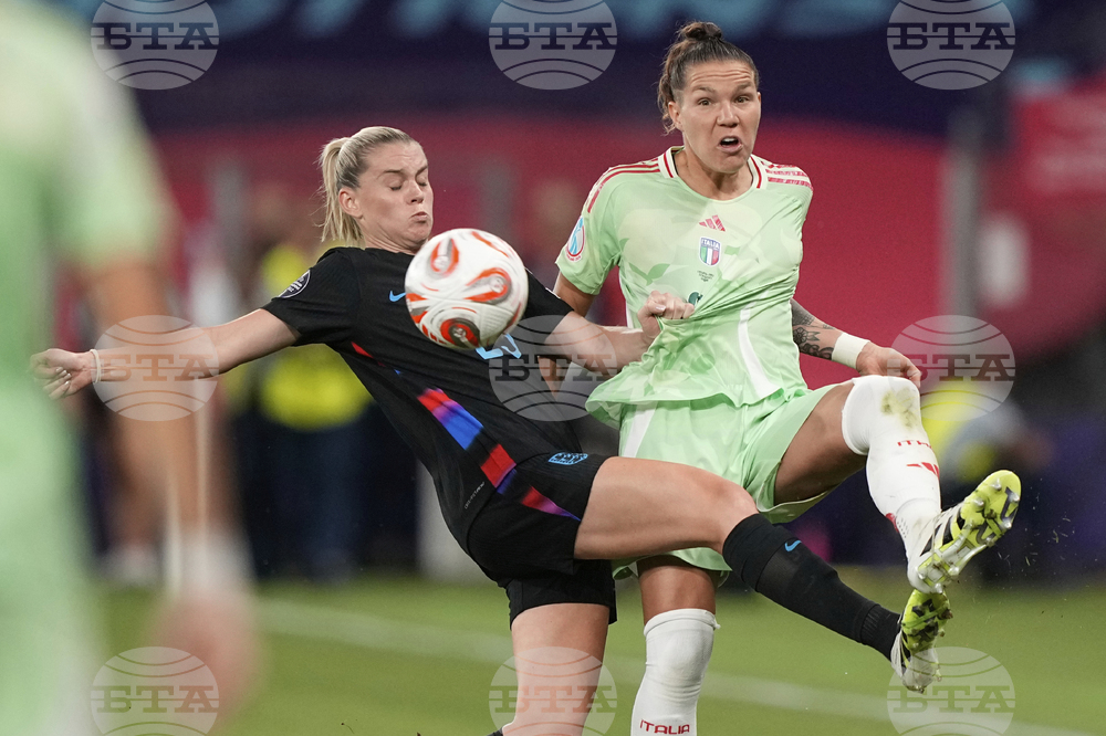 Italy's Cristiana Girelli, left, and England's Leah Williamson in action during the Women's Euro 2025 semifinal soccer match between England and Italy at Stade de Geneve in Geneva, Switzerland, Tuesday, July 22, 2025. (Jean-Christophe Bott/Keystone via AP)