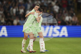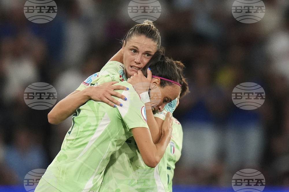 Italy's Michela Cambiaghi, left, and Arianna Caruso, right, reacts after losing to England in the Women's Euro 2025 semifinals soccer match between England and Italy at Stade de Geneve in Geneva, Switzerland, Tuesday, July 22, 2025. (Martial Trezzini/Keystone via AP)
