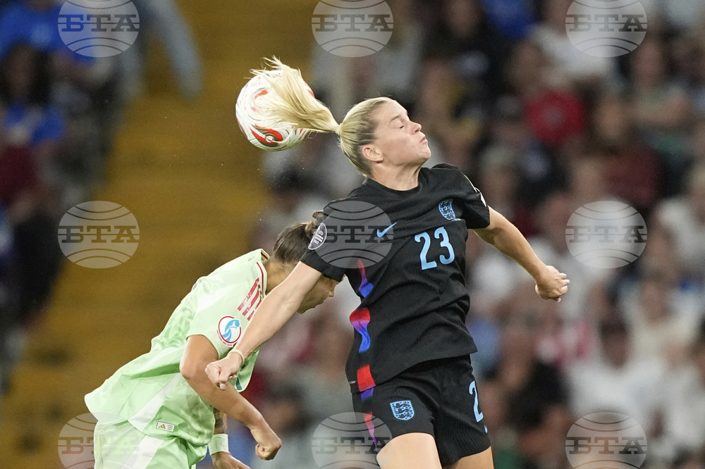 England's Lauren Hemp, left, jumps for the ball with Italy's Barbara Bonansea during the Women's Euro 2025 semifinals soccer match between England and Italy at Stade de Geneve in Geneva, Switzerland, Tuesday, July 22, 2025. (AP Photo/Alessandra Tarantino)