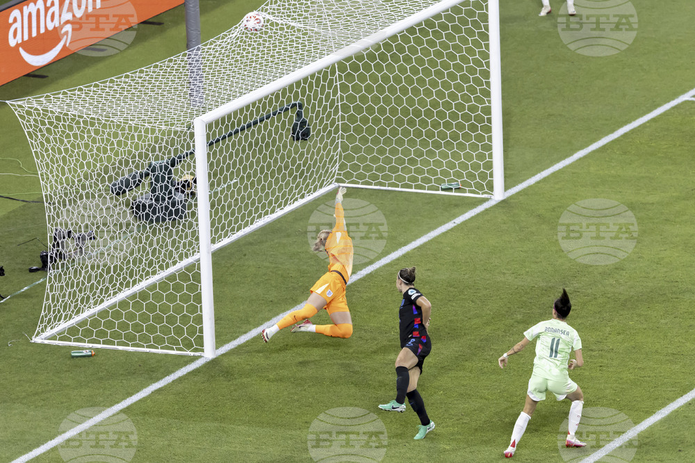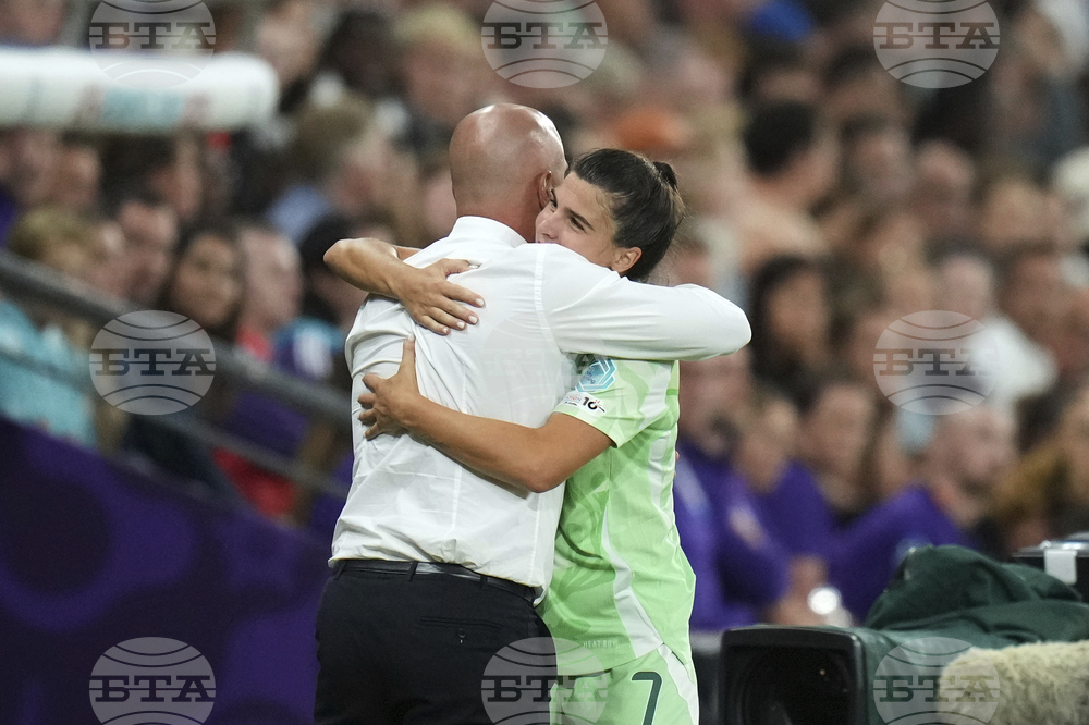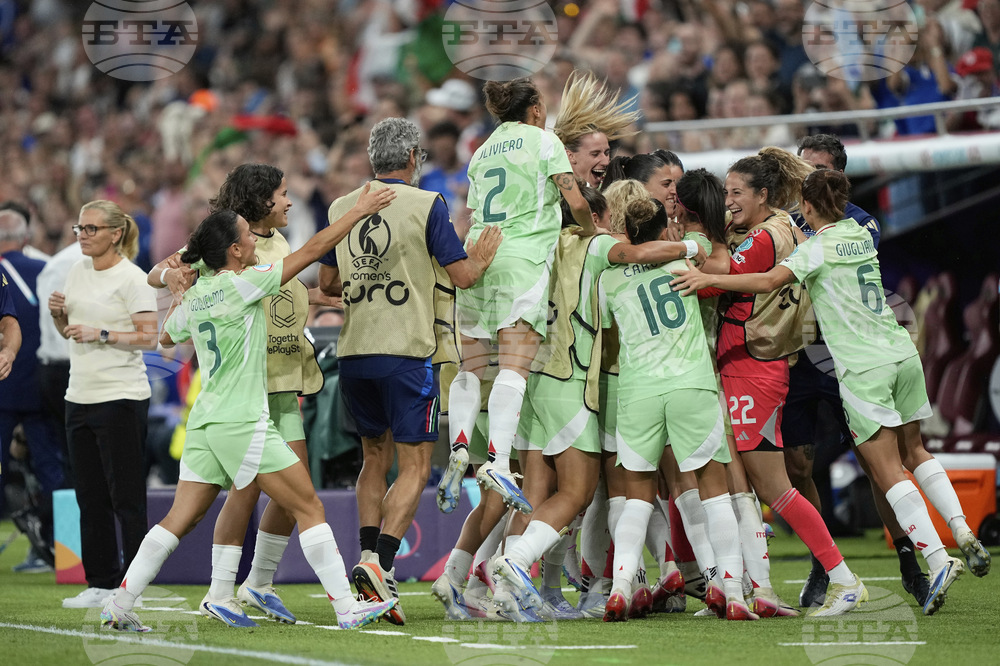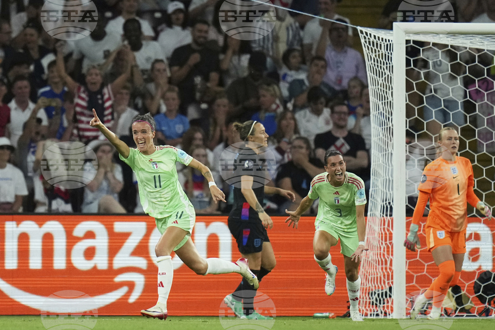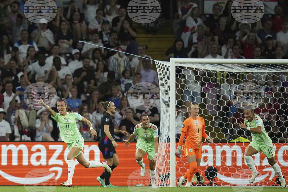 England head coach Sarina Wiegman, left, looks on as Italy players celebrate after Italy's Barbara Bonansea scored her side's opening goal during the Women's Euro 2025 semifinals soccer match between England and Italy at Stade de Geneve in Geneva, Switzerland, Tuesday, July 22, 2025. (AP Photo/Martin Meissner)