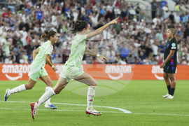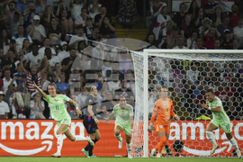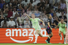 England's Chloe Kelly is celebrated after she scored the decisive second goal for England during the Women's Euro 2025 semifinals soccer match between England and Italy at Stade de Geneve in Geneva, Switzerland, Tuesday, July 22, 2025. (AP Photo/Martin Meissner)
