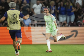England's Chloe Kelly celebrates after she scored her side's second goal during the Women's Euro 2025 semifinals soccer match between England and Italy at Stade de Geneve in Geneva, Switzerland, Tuesday, July 22, 2025. (AP Photo/Martin Meissner)
