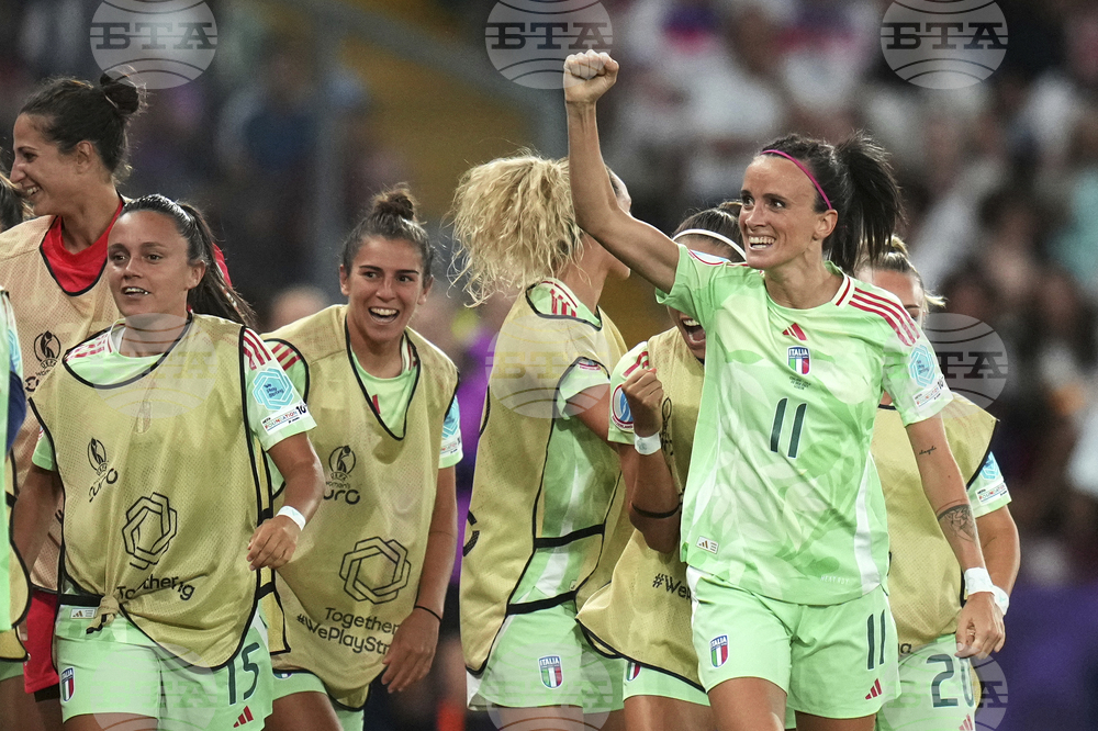 Italy's players celebrate after Barbara Bonansea scored the opening goal during the Women's Euro 2025 semifinals soccer match between England and Italy at Stade de Geneve in Geneva, Switzerland, Tuesday, July 22, 2025. (Salvatore Di Nolfi/Keystone via AP)