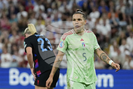 Italy's Barbara Bonansea stands on the pitch ahead of the Women's Euro 2025 semifinals soccer match between England and Italy at Stade de Geneve in Geneva, Switzerland, Tuesday, July 22, 2025. (AP Photo/Martin Meissner)