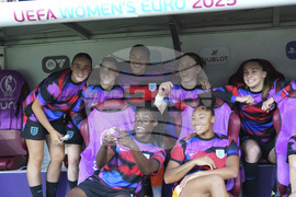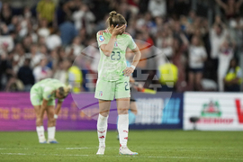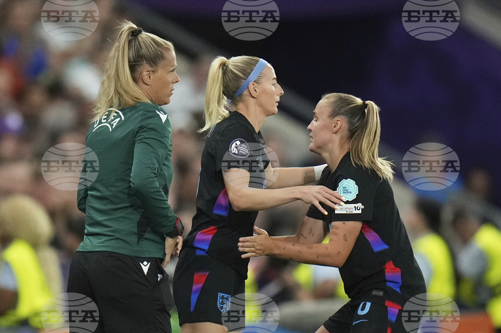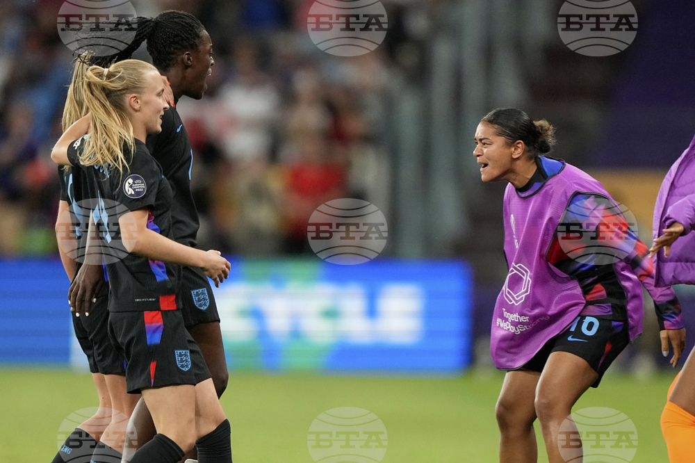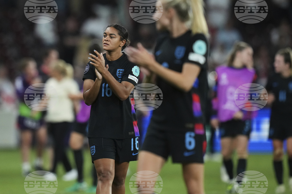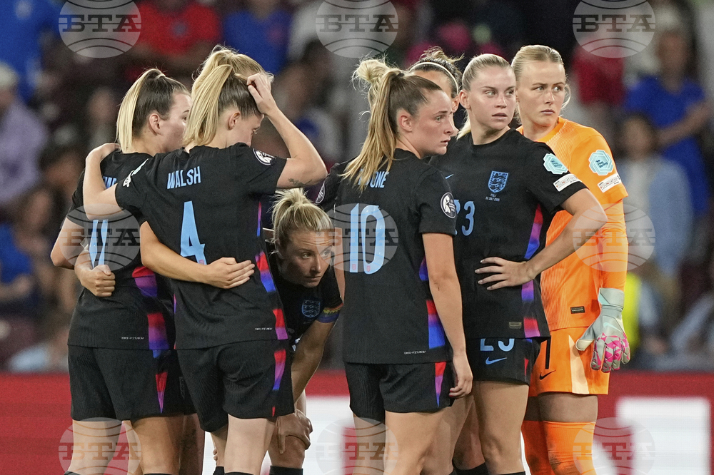 England players sit on the bench before the Women's Euro 2025 semifinals soccer match between England and Italy at Stade de Geneve in Geneva, Switzerland, Tuesday, July 22, 2025. (AP Photo/Martin Meissner)