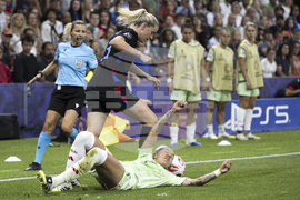 Italy's Cristiana Girelli falls to the ground after a foul from England's Lucy Bronze during the Women's Euro 2025 semifinals soccer match between England and Italy at Stade de Geneve in Geneva, Switzerland, Tuesday, July 22, 2025. (AP Photo/Alessandra Tarantino)