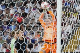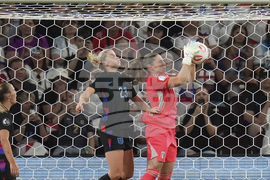 England goalkeeper Hannah Hampton catches a ball during the Women's Euro 2025 semifinals soccer match between England and Italy at Stade de Geneve in Geneva, Switzerland, Tuesday, July 22, 2025. (AP Photo/Alessandra Tarantino)