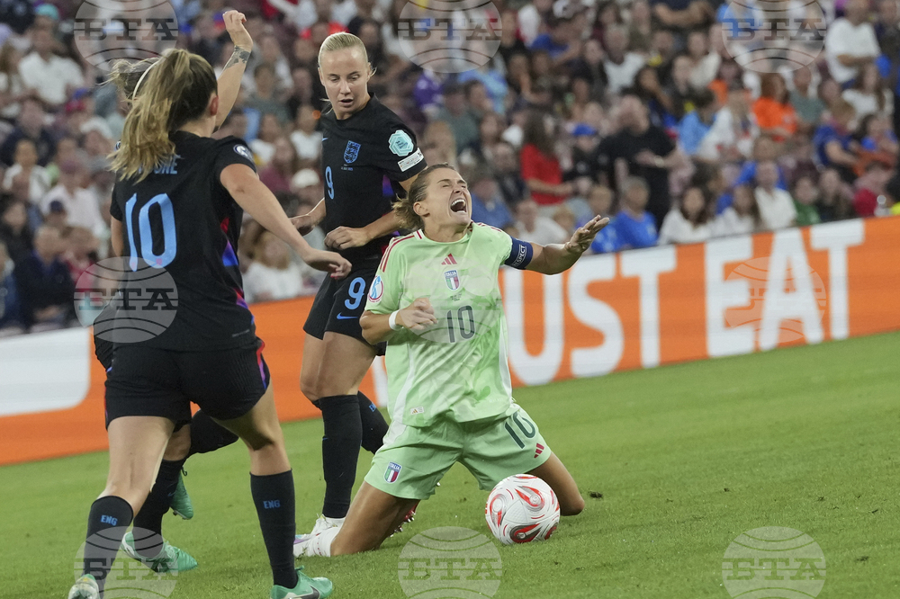 Italy's Michela Cambiaghi falls to the ground during the Women's Euro 2025 semifinals soccer match between England and Italy at Stade de Geneve in Geneva, Switzerland, Tuesday, July 22, 2025. (AP Photo/Alessandra Tarantino)
