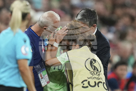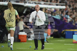 England head coach Sarina Wiegman picks up the ball during the Women's Euro 2025 semifinals soccer match between England and Italy at Stade de Geneve in Geneva, Switzerland, Tuesday, July 22, 2025. (AP Photo/Alessandra Tarantino)