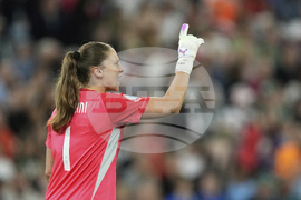 Italy goalkeeper Laura Giuliani gestures during the Women's Euro 2025 semifinals soccer match between England and Italy at Stade de Geneve in Geneva, Switzerland, Tuesday, July 22, 2025. (AP Photo/Alessandra Tarantino)