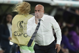 Italy head coach Andrea Soncin sits on the bench during the Women's Euro 2025 semifinals soccer match between England and Italy at Stade de Geneve in Geneva, Switzerland, Tuesday, July 22, 2025. (AP Photo/Alessandra Tarantino)