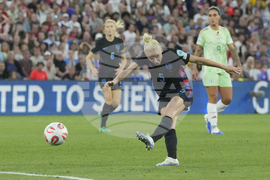 England's Chloe Kelly kicks a penalty which was saved but from which she scored the rebound during the Women's Euro 2025 semifinals soccer match between England and Italy at Stade de Geneve in Geneva, Switzerland, Tuesday, July 22, 2025. (AP Photo/Martin Meissner)