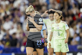 England's Jess Carter sits on the bench before the Women's Euro 2025 semifinals soccer match between England and Italy at Stade de Geneve in Geneva, Switzerland, Tuesday, July 22, 2025. (AP Photo/Martin Meissner)