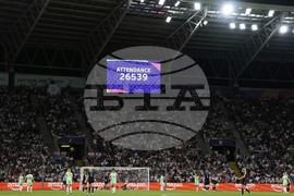 Fans on the stands wait for the start of the Women's Euro 2025 semifinals soccer match between England and Italy at Stade de Geneve in Geneva, Switzerland, Tuesday, July 22, 2025. (AP Photo/Alessandra Tarantino)