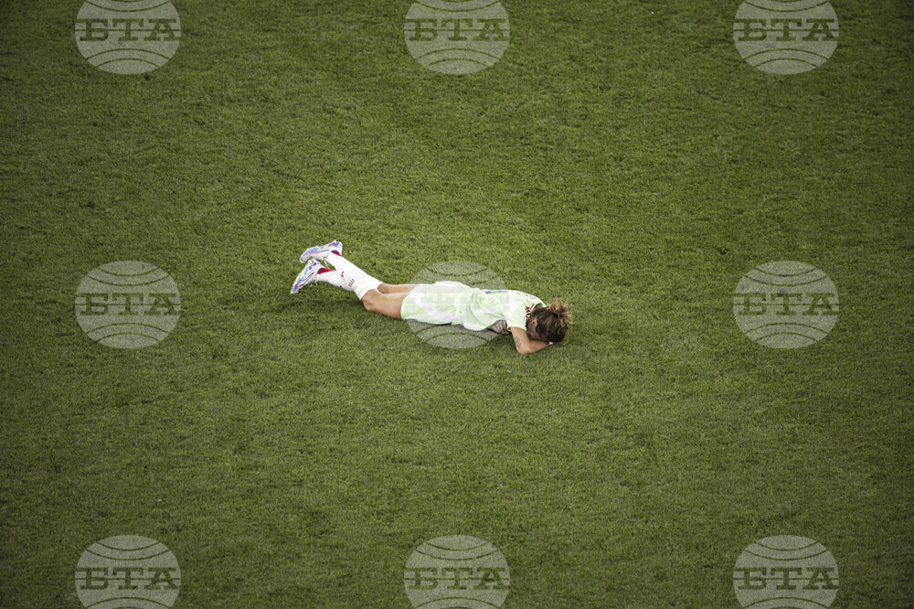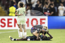 Italy's Arianna Caruso, on the ground and teammate Michela Cambiaghi react after losing the Women's Euro 2025 semifinals soccer match between England and Italy at Stade de Geneve in Geneva, Switzerland, Tuesday, July 22, 2025. (AP Photo/Alessandra Tarantino)
