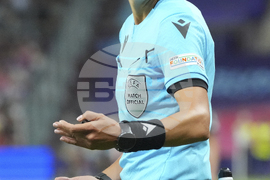 Referee Ivana Martincic awards a penalty from which England eventually scored their second goal during the Women's Euro 2025 semifinals soccer match between England and Italy at Stade de Geneve in Geneva, Switzerland, Tuesday, July 22, 2025. (AP Photo/Martin Meissner)