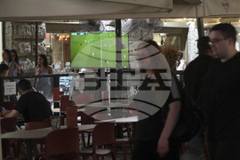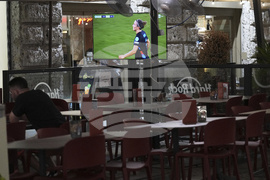 A man sits in a bar with a live streaming of the Women's Euro 2025 semifinal soccer match between England and Italy in downtown Milan, Italy, Tuesday, July 22, 2025. (AP Photo/Antonio Calanni)