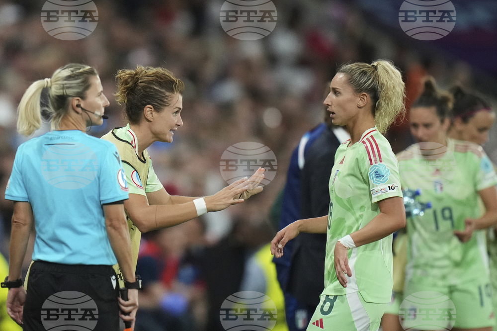 Italy players react after Referee Ivana Martincic awarded a penalty to England during the Women's Euro 2025 semifinals soccer match between England and Italy at Stade de Geneve in Geneva, Switzerland, Tuesday, July 22, 2025. (AP Photo/Alessandra Tarantino)