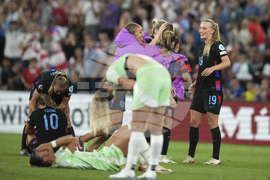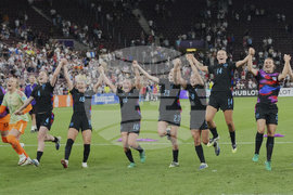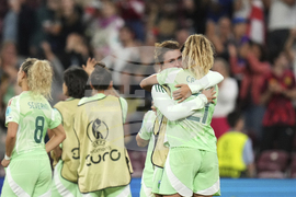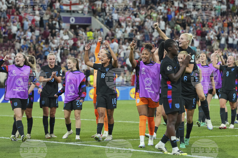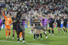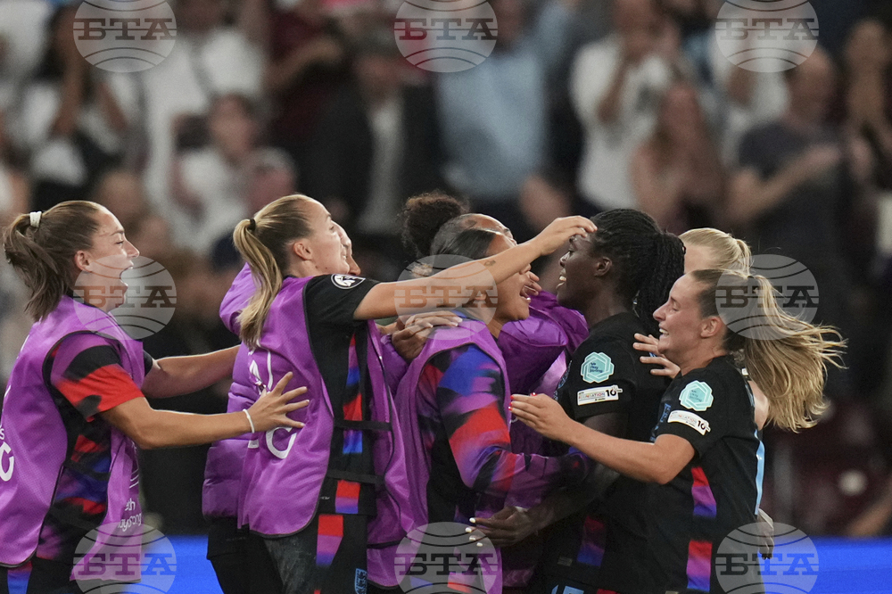 England players celebrate after winning the Women's Euro 2025 semifinals soccer match between England and Italy at Stade de Geneve in Geneva, Switzerland, Tuesday, July 22, 2025. (AP Photo/Alessandra Tarantino)