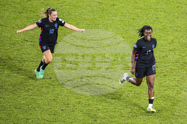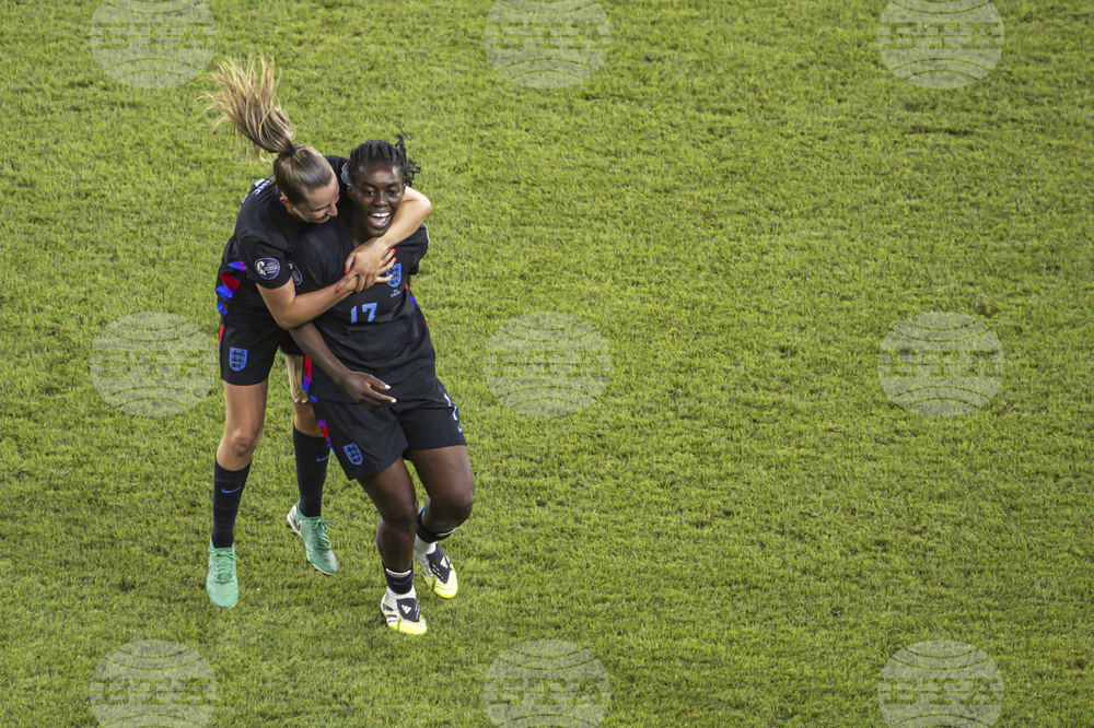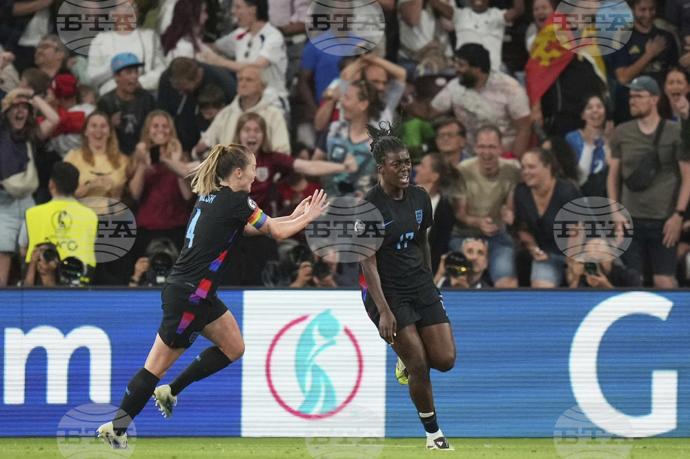 England's Michelle Agyemang, right, and Ella Toone celebrate after Agyemang scored their opening goal during the Women's Euro 2025 semifinals soccer match between England and Italy at Stade de Geneve in Geneva, Switzerland, Tuesday, July 22, 2025. (Salvatore Di Nolfi/Keystone via AP)