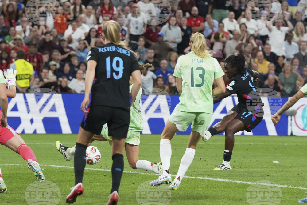 England's Michelle Agyemang, right, scores her side's first goal during the Women's Euro 2025 semifinals soccer match between England and Italy at Stade de Geneve in Geneva, Switzerland, Tuesday, July 22, 2025 (AP Photo/Martin Meissner)