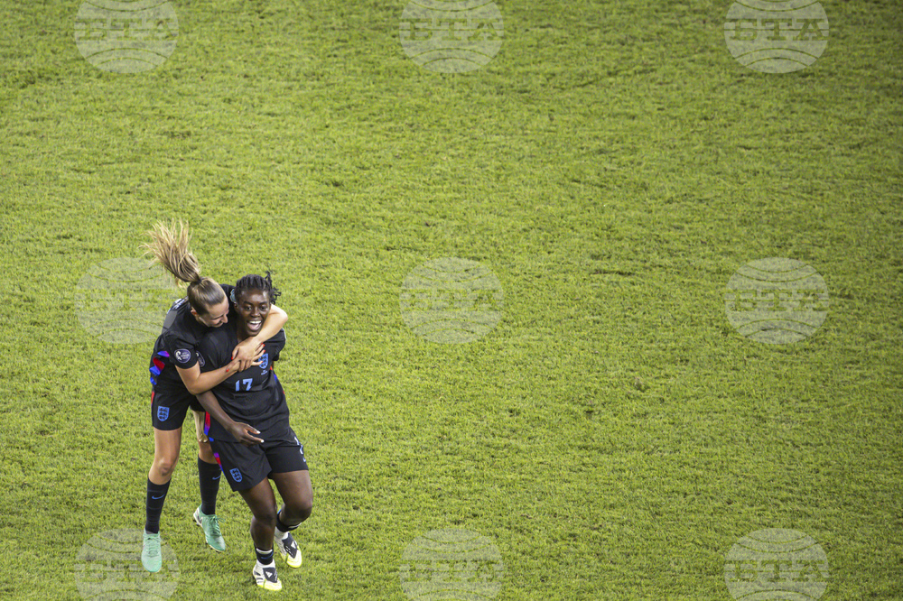 England's Michelle Agyemang, right, celebrates after scoring her side's first goal during the Women's Euro 2025 semifinals soccer match between England and Italy at Stade de Geneve in Geneva, Switzerland, Tuesday, July 22, 2025. (Salvatore Di Nolfi/Keystone via AP)