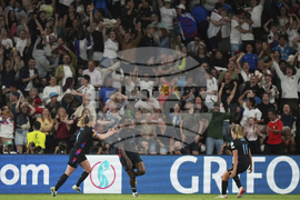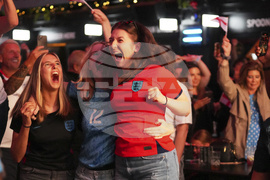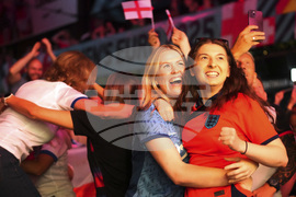 England supporters celebrate during a live screening of the Women's Euro 2025 semifinals soccer match between England and Italy at the Boxpark in Croydon,London, Tuesday, July 22, 2025 . (AP Photo/Joanna Chan)