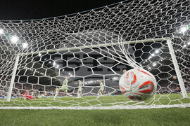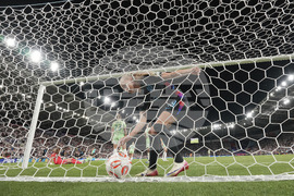 Italy goalkeeper Laura Giuliani fails to save the goal from England's Chloe Kelly during the Women's Euro 2025 semifinals soccer match between England and Italy at Stade de Geneve in Geneva, Switzerland, Tuesday, July 22, 2025. (AP Photo/Martin Meissner)