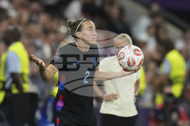 England head coach Sarina Wiegman throws the ball to England's Lucy Bronze during the Women's Euro 2025 semifinals soccer match between England and Italy at Stade de Geneve in Geneva, Switzerland, Tuesday, July 22, 2025. (AP Photo/Alessandra Tarantino)