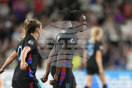 England's Michelle Agyemang, centre, scores her side's first goal during the Women's Euro 2025 semifinals soccer match between England and Italy at Stade de Geneve in Geneva, Switzerland, Tuesday, July 22, 2025 (AP Photo/Martin Meissner)