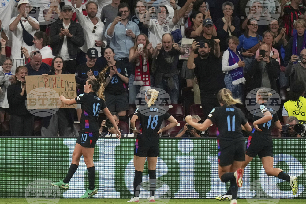 England's team players celebrate after Michelle Agyemang scored her side's first goal during the Women's Euro 2025 semifinals soccer match between England and Italy at Stade de Geneve in Geneva, Switzerland, Tuesday, July 22, 2025. (Martial Trezzini/Keystone via AP)