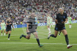England's Chloe Kelly, right, celebrates after scoring her side's second goal during the Women's Euro 2025 semifinals soccer match between England and Italy at Stade de Geneve in Geneva, Switzerland, Tuesday, July 22, 2025. (AP Photo/Martin Meissner)