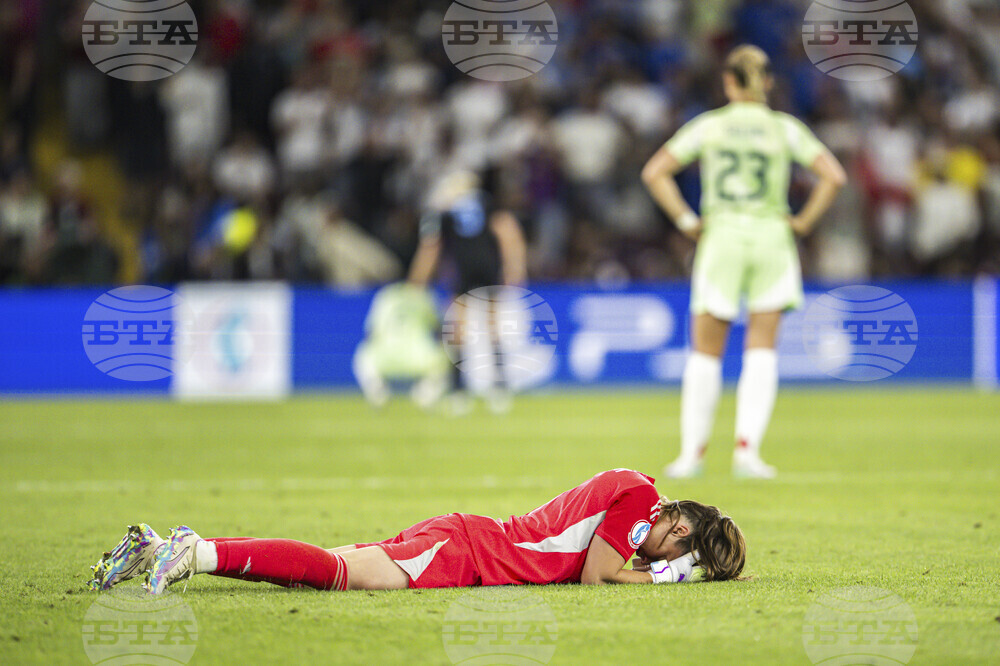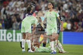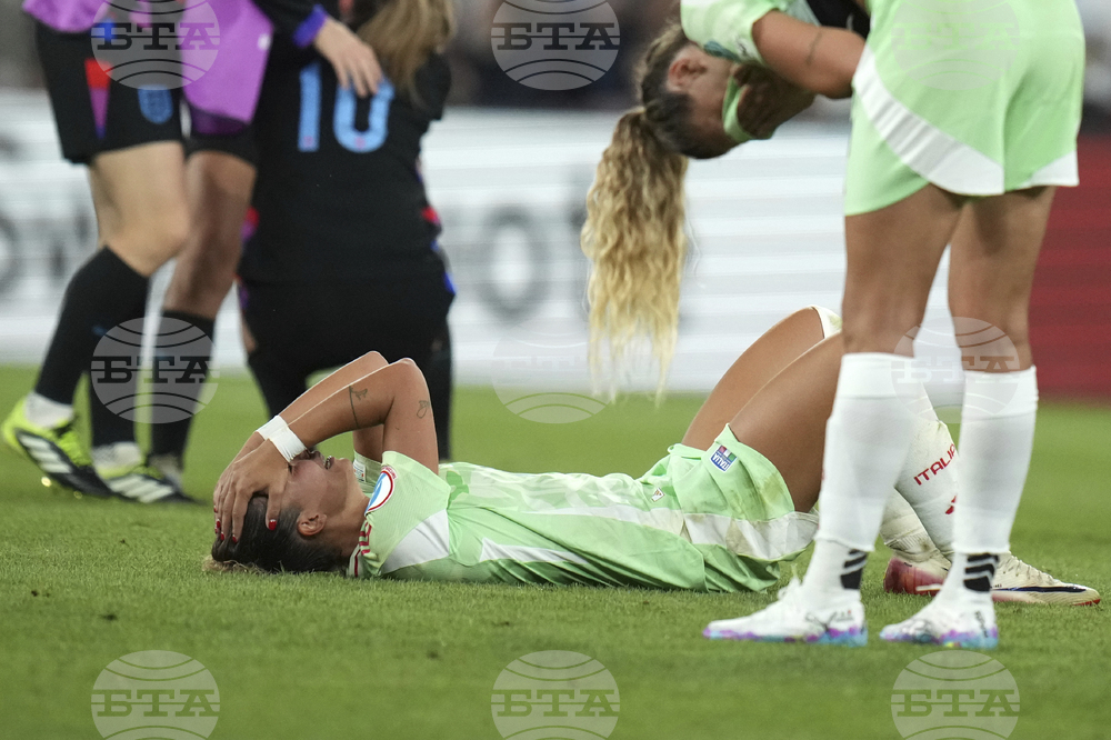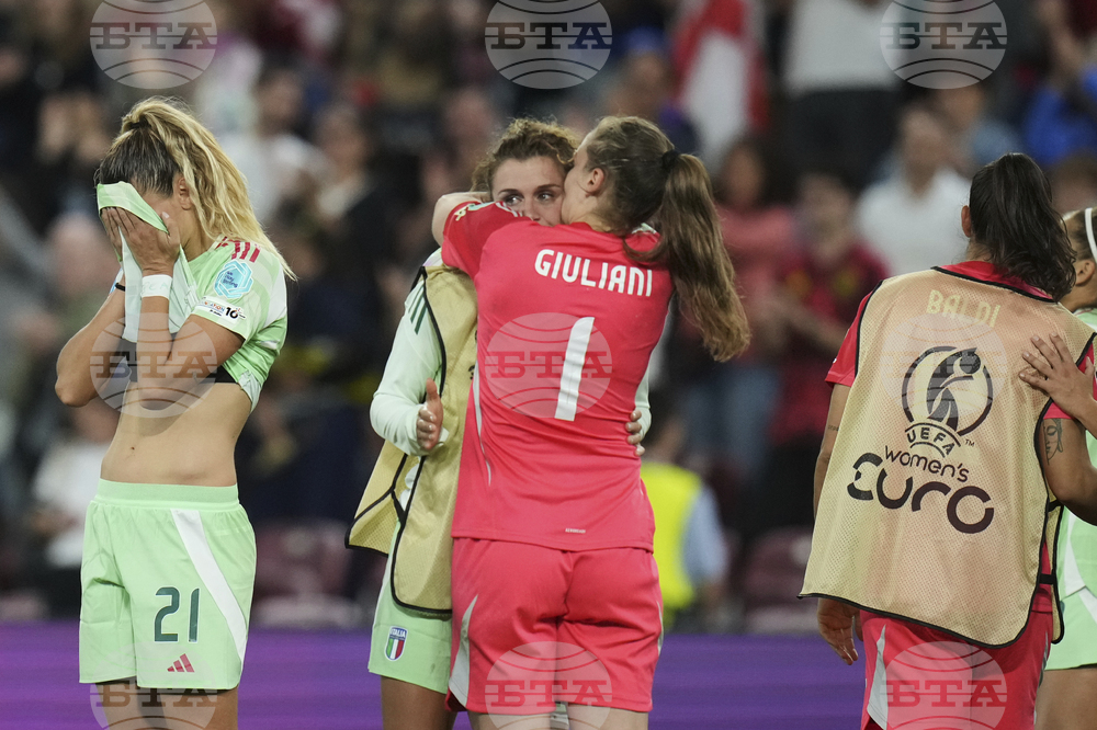Italian players react fter the Women's Euro 2025 semifinals soccer match between England and Italy at Stade de Geneve in Geneva, Switzerland, Tuesday, July 22, 2025. (Salvatore Di Nolfi/Keystone via AP)