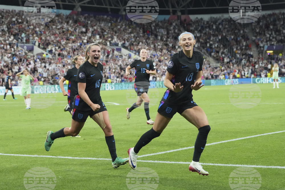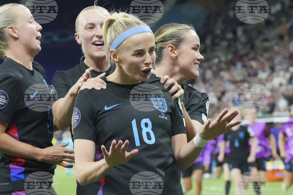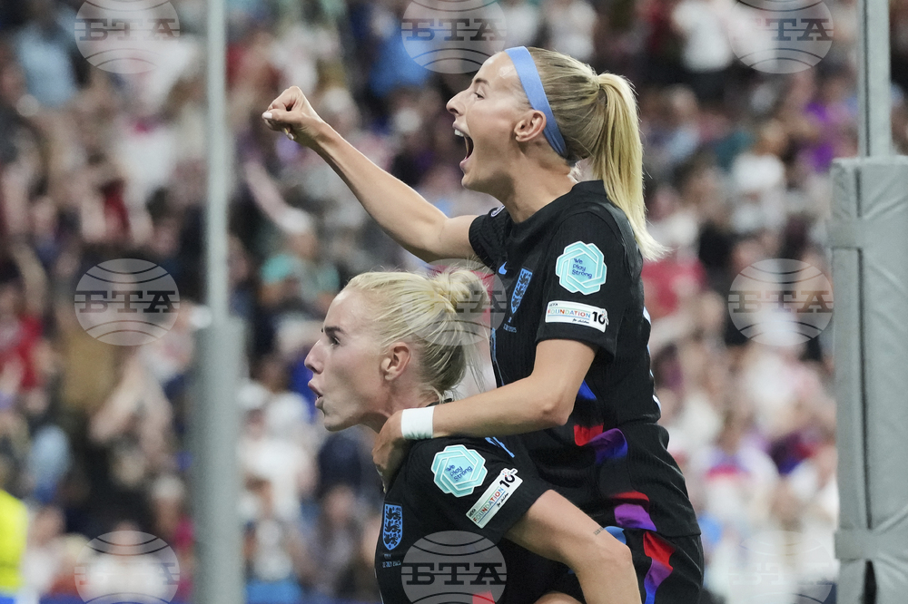 England's Chloe Kelly, left, and Ella Toone, right, celebrate after Kelly scored a goa during the Women's Euro 2025 semifinals soccer match between England and Italy at Stade de Geneve in Geneva, Switzerland, Tuesday, July 22, 2025. ( Martial Trezzini/Keystone via AP)
