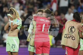 Italy players embrace each other before the Women's Euro 2025 semifinals soccer match between England and Italy at Stade de Geneve in Geneva, Switzerland, Tuesday, July 22, 2025. (AP Photo/Alessandra Tarantino)