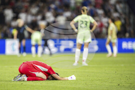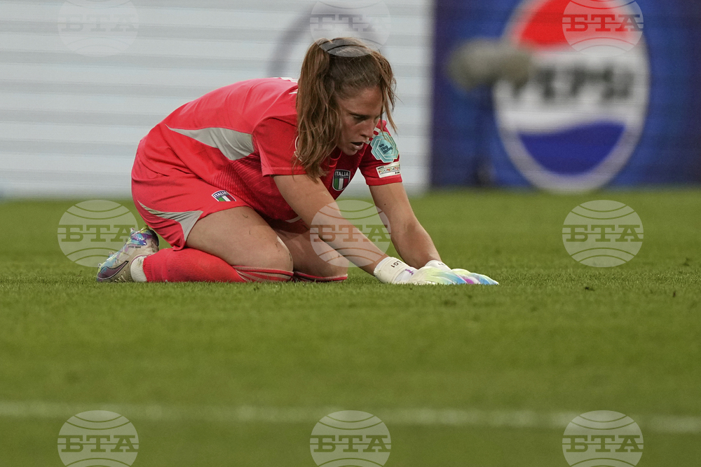 Italy's goalkeeper Laura Giuliani reacts after losing to England in the Women's Euro 2025 semifinals soccer match between England and Italy at Stade de Geneve in Geneva, Switzerland, Tuesday, July 22, 2025. (AP Photo/Martin Meissner)