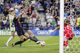 Italy's Barbara Bonansea, right, scores the opening goal past England's goalkeeper Hannah Hampton during the Women's Euro 2025 semifinals soccer match between England and Italy at Stade de Geneve in Geneva, Switzerland, Tuesday, July 22, 2025. (Salvatore Di Nolfi/Keystone via AP)