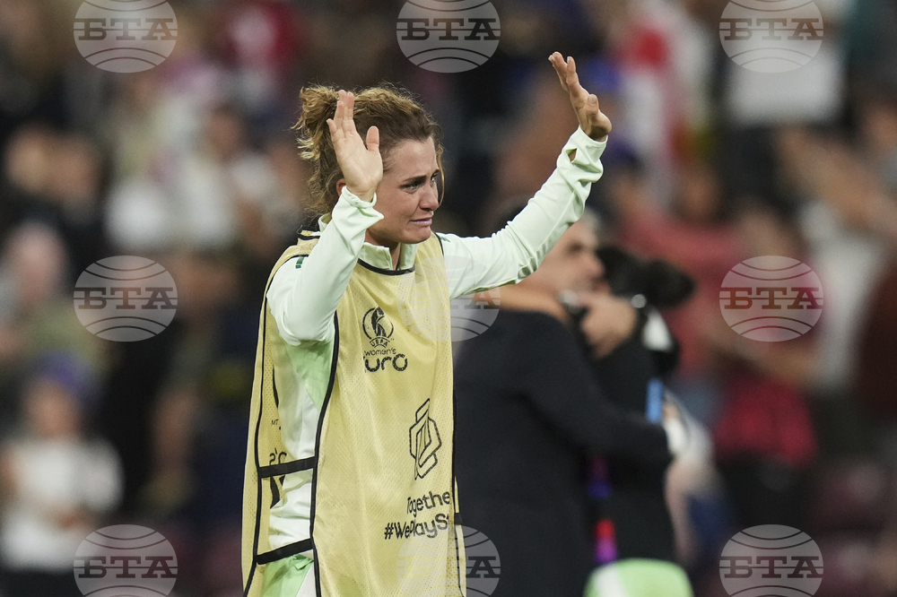 England's Beth Mead and Leah Williamson, right, applaud the fans after winning the Women's Euro 2025 semifinals soccer match between England and Italy at Stade de Geneve in Geneva, Switzerland, Tuesday, July 22, 2025. (AP Photo/Alessandra Tarantino)
