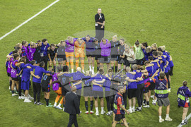 England players and staff gather in a circle after the Women's Euro 2025 semifinals soccer match between England and Italy at Stade de Geneve in Geneva, Switzerland, Tuesday, July 22, 2025. (Salvatore Di Nolfi/Keystone via AP)