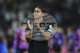 England's Esme Morgan applauds the fans at the end of the Women's Euro 2025 semifinals soccer match between England and Italy at Stade de Geneve in Geneva, Switzerland, Tuesday, July 22, 2025. (AP Photo/Alessandra Tarantino)