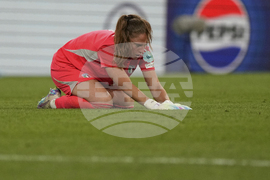 Italy goalkeeper Laura Giuliani wipes her gloves during the Women's Euro 2025 semifinals soccer match between England and Italy at Stade de Geneve in Geneva, Switzerland, Tuesday, July 22, 2025. (AP Photo/Alessandra Tarantino)