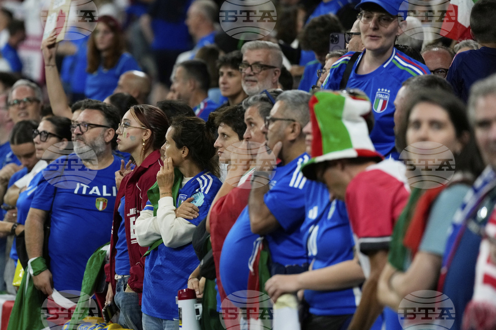 Italy supporters react at the end of the Women's Euro 2025 semifinals soccer match between England and Italy at Stade de Geneve in Geneva, Switzerland, Tuesday, July 22, 2025. (AP Photo/Alessandra Tarantino)