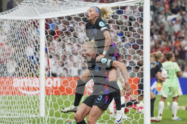 England's Chloe Kelly, top, and Michelle Agyemang, bottom, both whom scored goals, celebrate after the Women's Euro 2025 semifinals soccer match between England and Italy at Stade de Geneve in Geneva, Switzerland, Tuesday, July 22, 2025. (Jean-Christophe Bott/Keystone via AP)