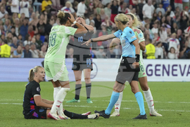 England's Michelle Agyemang, right, and referee Ivana Martincic during the Women's Euro 2025 semifinals soccer match between England and Italy at Stade de Geneve in Geneva, Switzerland, Tuesday, July 22, 2025. (AP Photo/Martin Meissner)